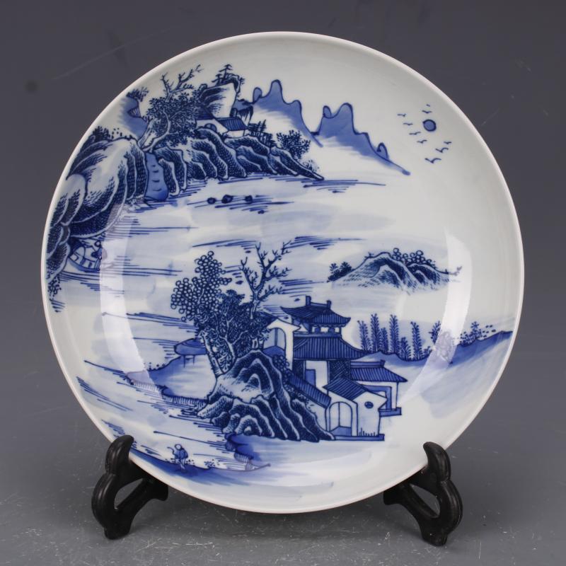 [2]清康熙青花山水人物盤手繪仿古老貨瓷器家居中式擺件古董古玩收藏1入