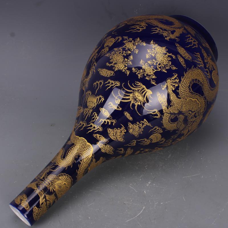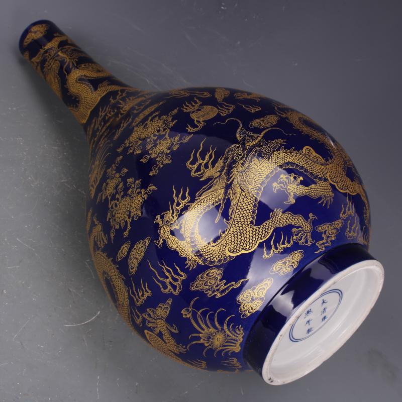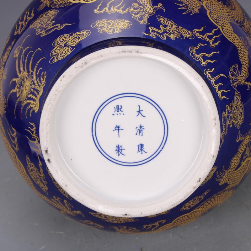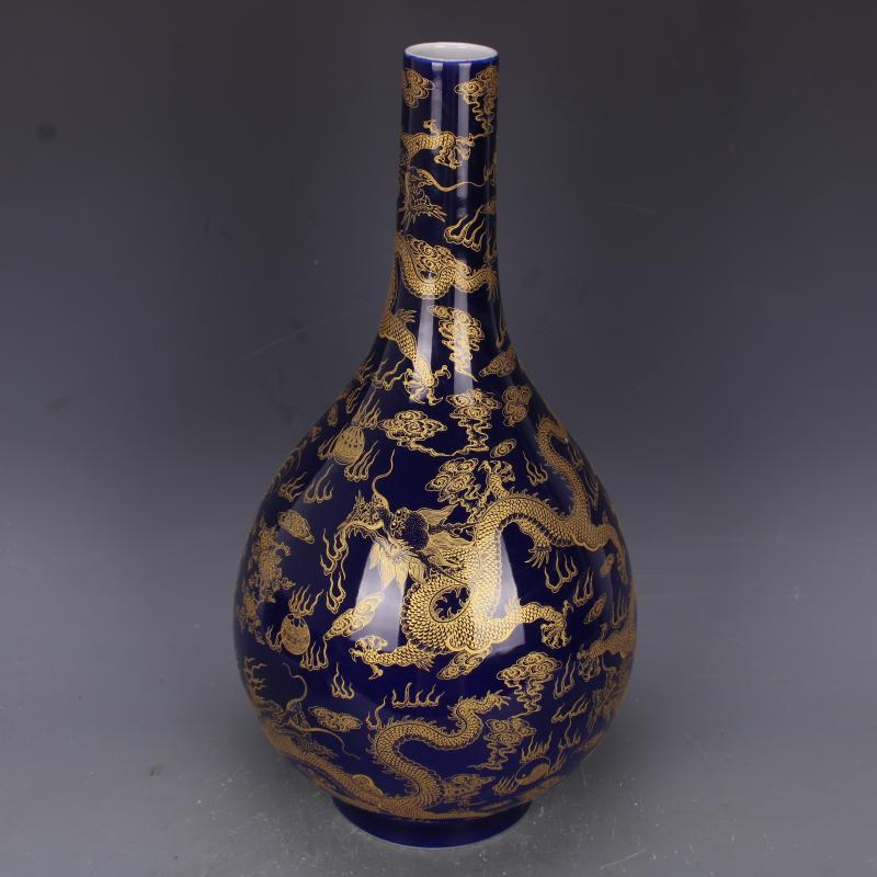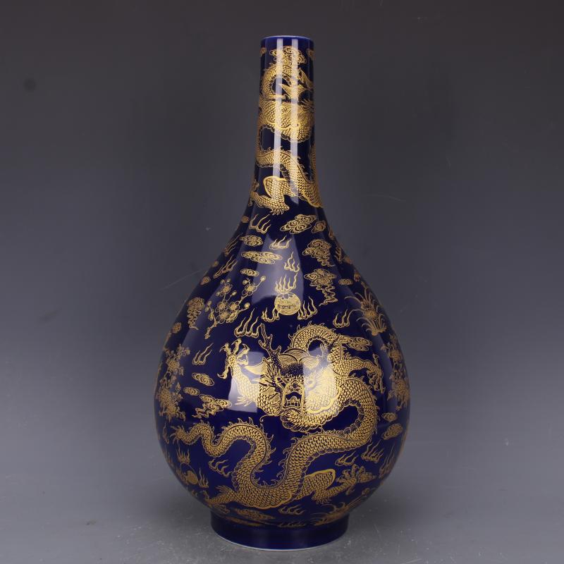 清康熙祭藍釉描金云龍紋膽瓶仿古瓷器中式家居擺件古董古玩收藏1入
