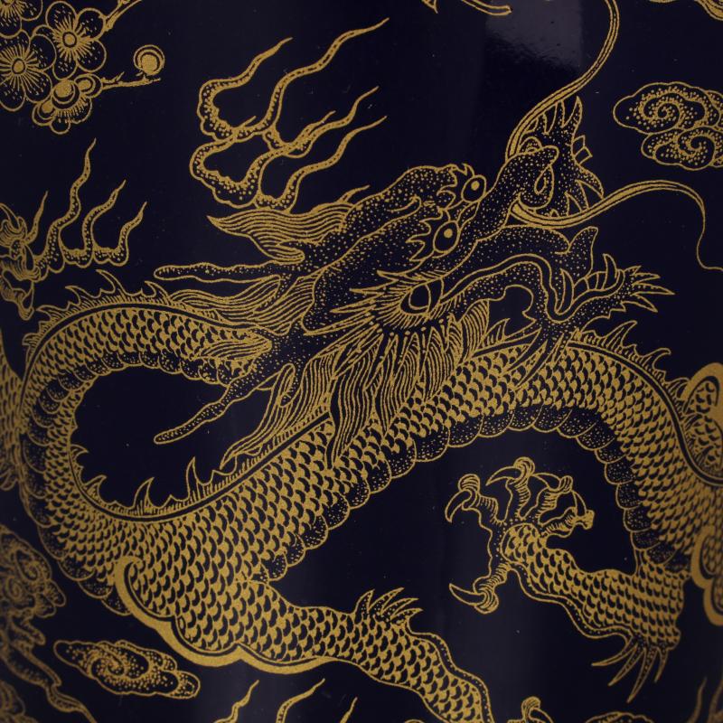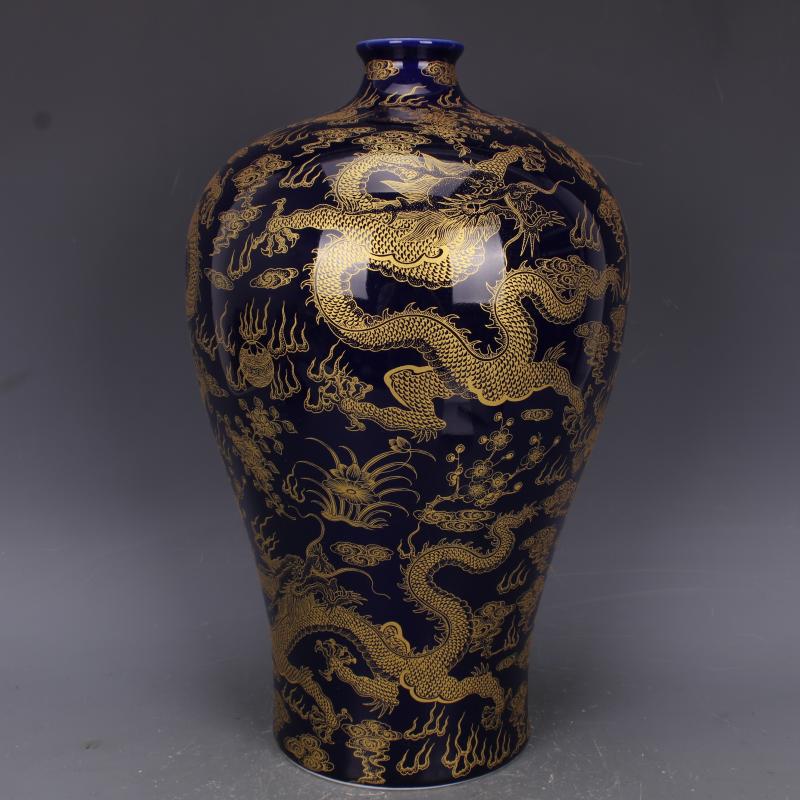 清康熙祭藍釉描金穿花云龍紋梅瓶仿古瓷器中式家居擺件古玩收藏1入