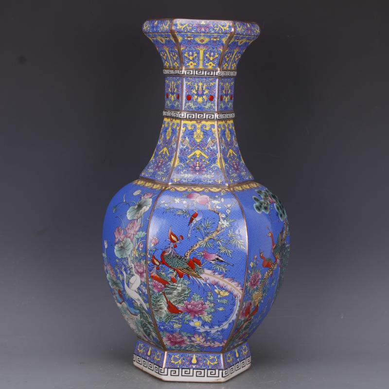清乾隆描金爬花琺瑯彩花鳥藍地六方賞瓶仿古鑲器瓷器古董古玩擺1入