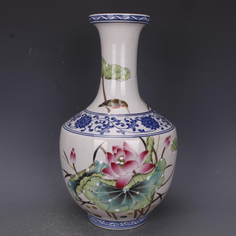 清乾隆青花斗彩荷花花鳥賞瓶仿古老貨瓷器家居中式擺件古玩收藏1入