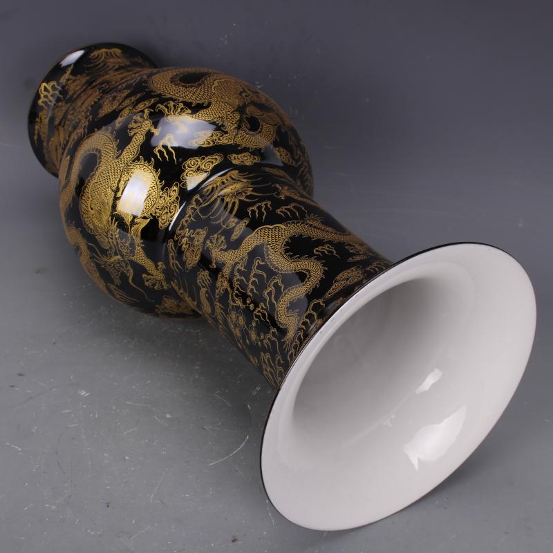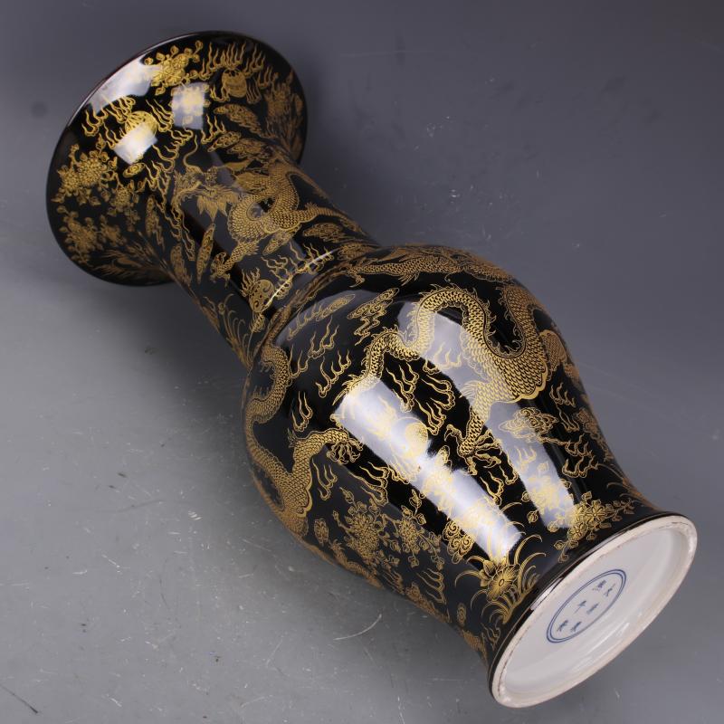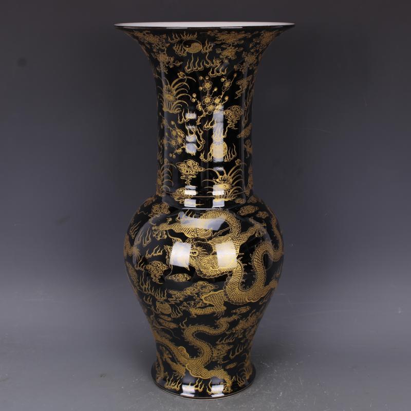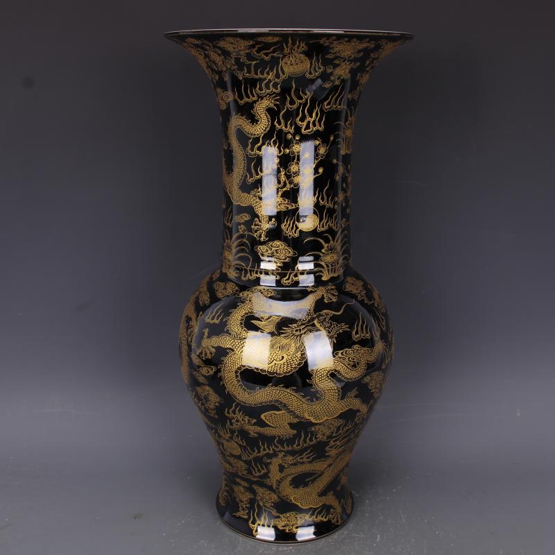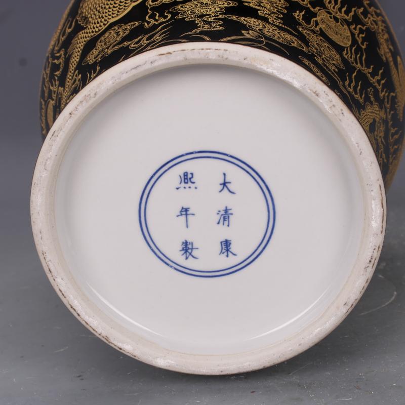 清康熙烏金釉描金穿花云龍紋花觚瓶仿古瓷器中式家居擺件古玩收藏1入