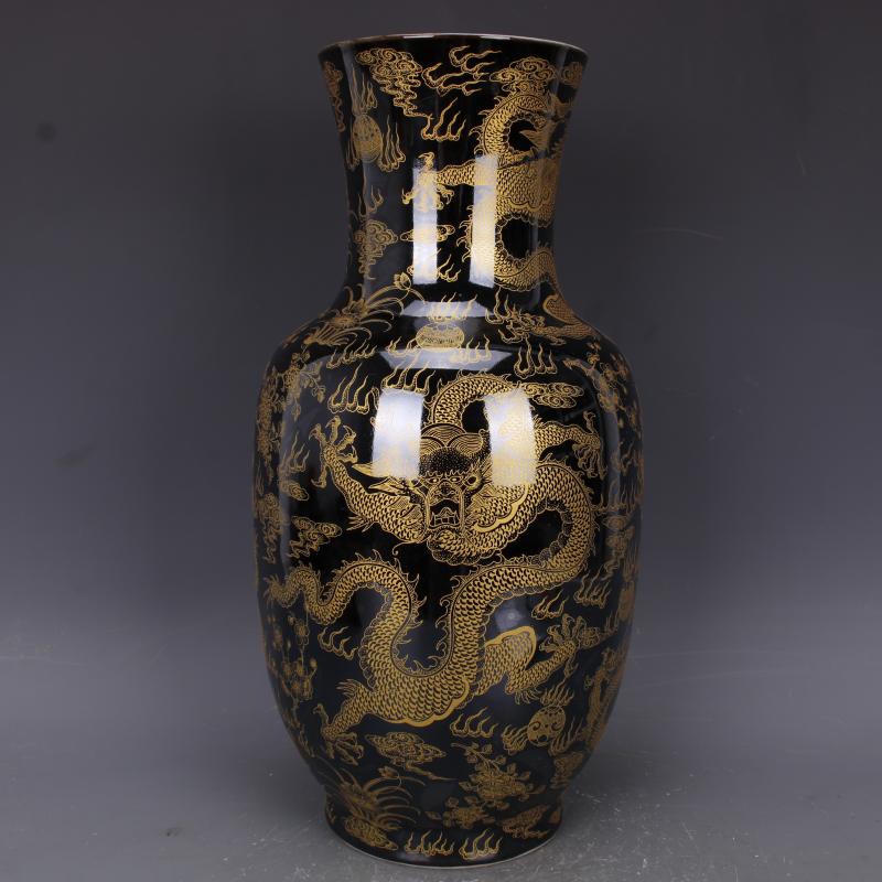 清康熙烏金釉描金穿花云龍紋觀音瓶仿古瓷器中式家居擺件古玩收藏1入