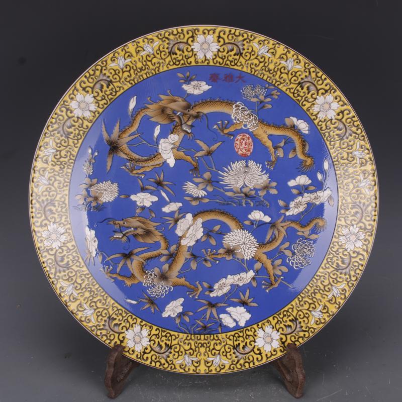 [2]清慈禧時期粉彩穿花龍紋平盤仿古老貨瓷器家居中式擺件古董古玩1入