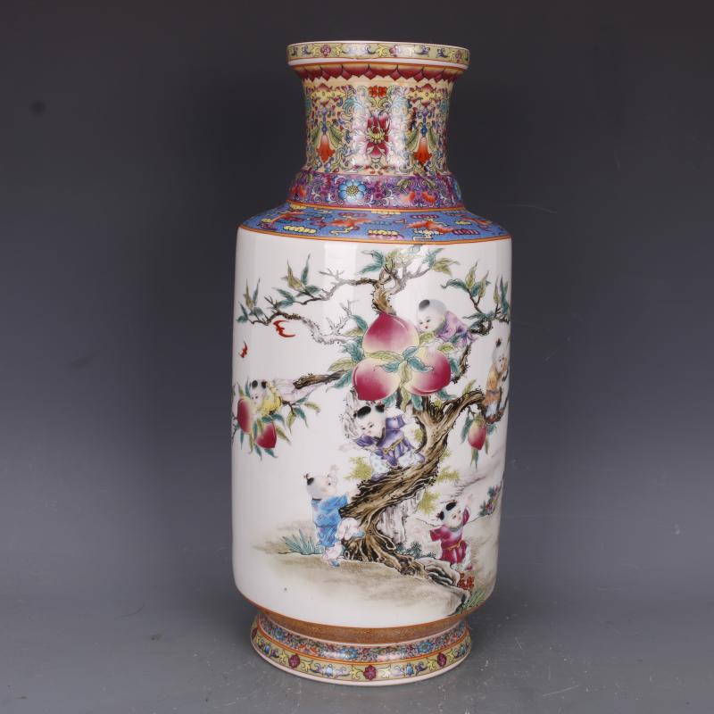 [2]清乾隆青花斗彩九子攀桃棒槌長筒瓶仿古瓷器家居中式擺件古董古玩1入