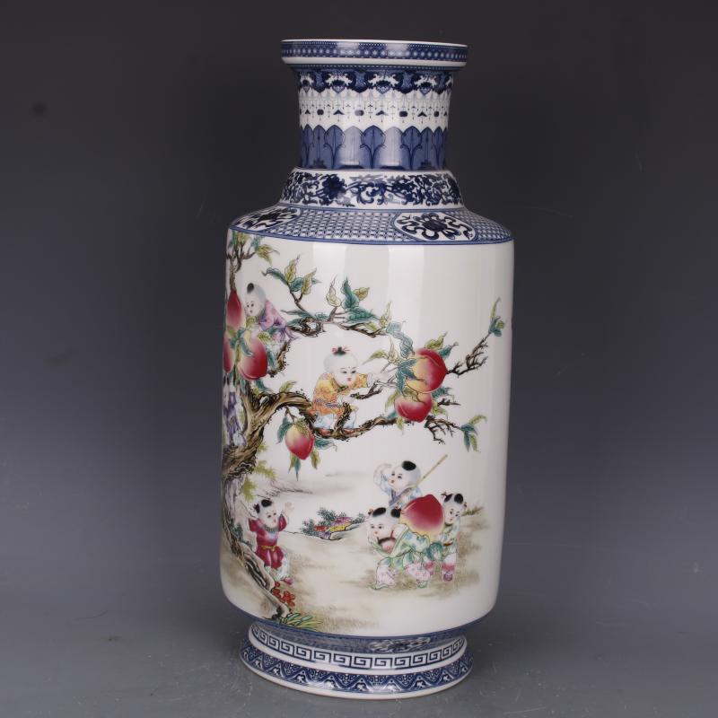 清乾隆青花斗彩九子攀桃棒槌長筒瓶仿古瓷器家居中式擺件古董古玩1入