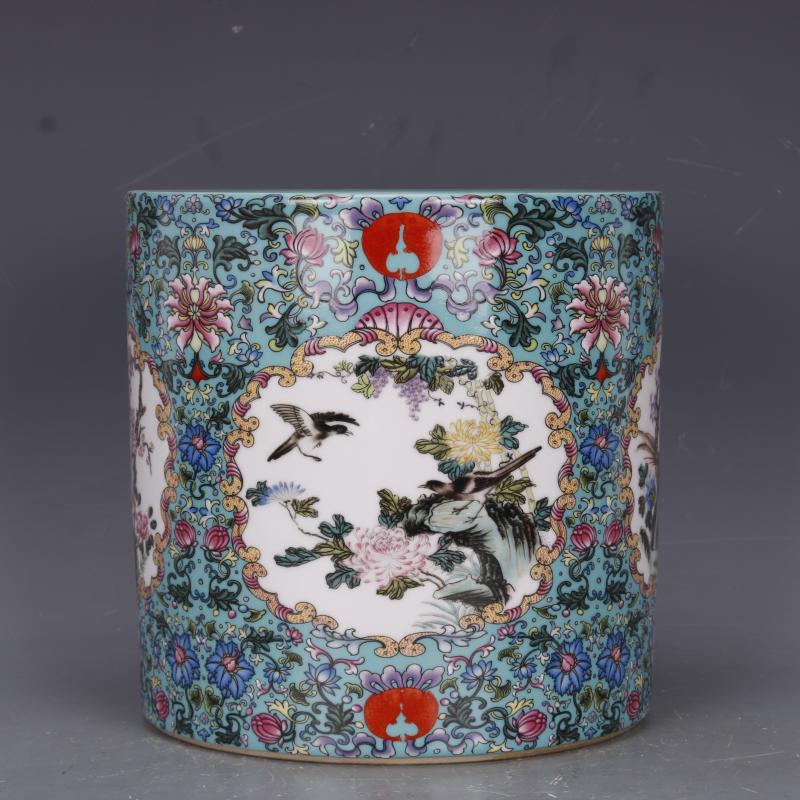 清乾隆琺瑯彩開光花鳥筆筒筆海仿古瓷器家居文房中式擺件古玩收藏1入