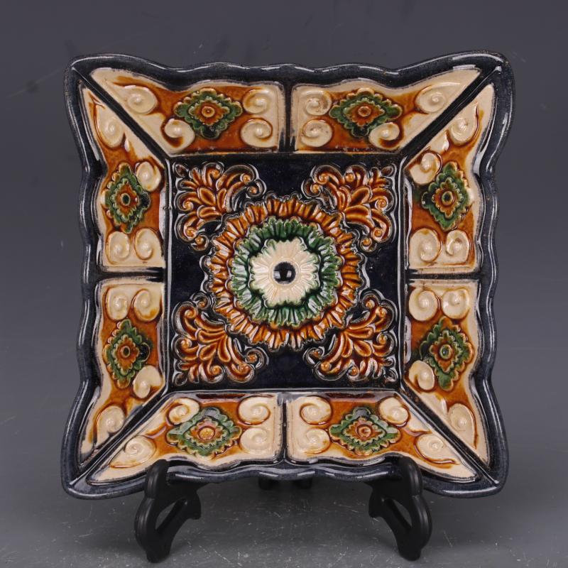 唐代三彩浮雕刻花紋四方盤果碟仿古出土瓷器家居擺件古董古玩收藏1入