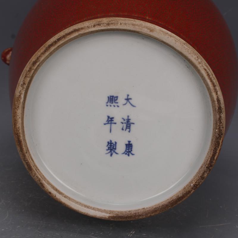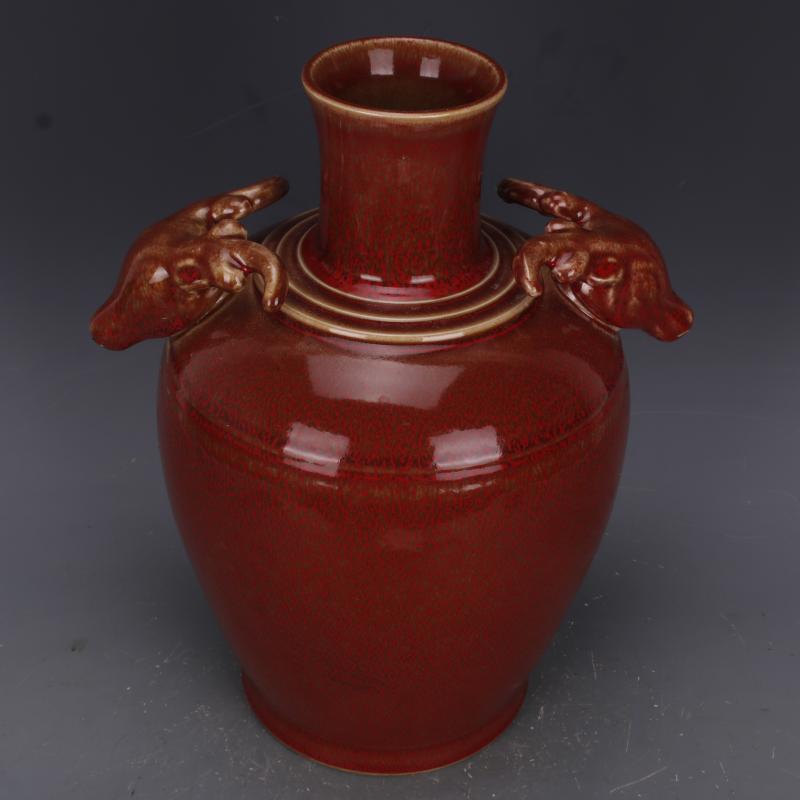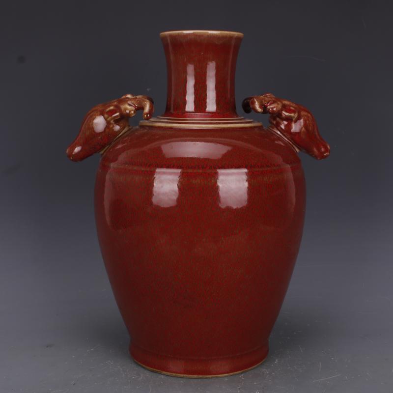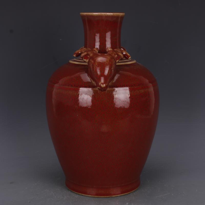 清康熙窯變紅花有鹿頭尊插花瓶手工仿古老貨瓷器家居中式古玩擺件1入