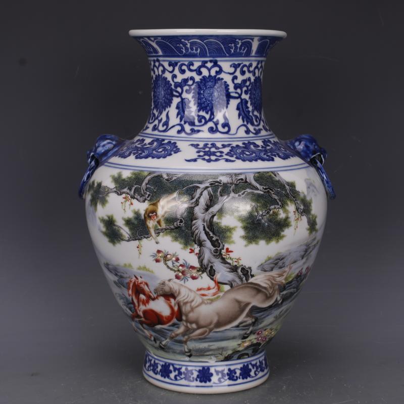 清乾隆青花斗彩馬上封侯紋花觚瓶仿古瓷器家居中式擺件古玩收藏1入