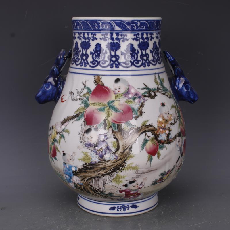 清乾隆青花斗彩九子攀桃紋鹿頭尊仿古瓷器家居中式擺件古玩收藏1入