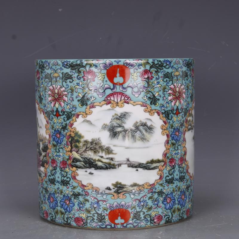 清乾隆琺瑯彩開光山水筆筒筆海仿古瓷器家居文房中式擺件古玩收藏1入