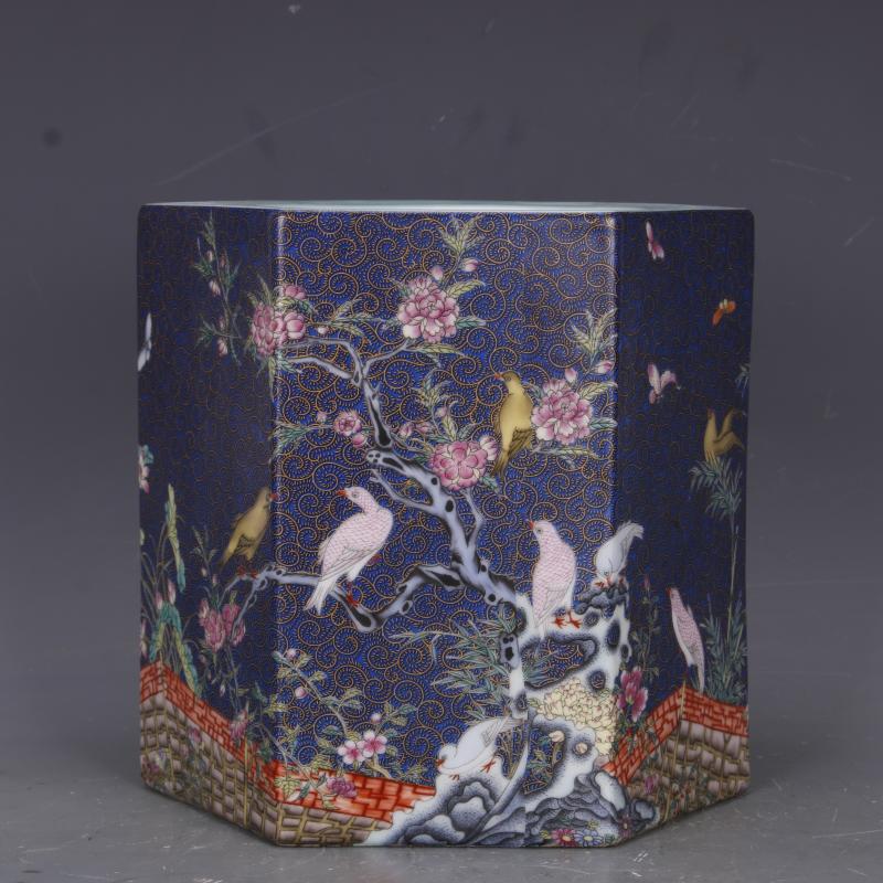清乾隆刻花琺瑯彩花鳥六方筆筒仿古瓷器家居文房中式擺件古玩收藏1入