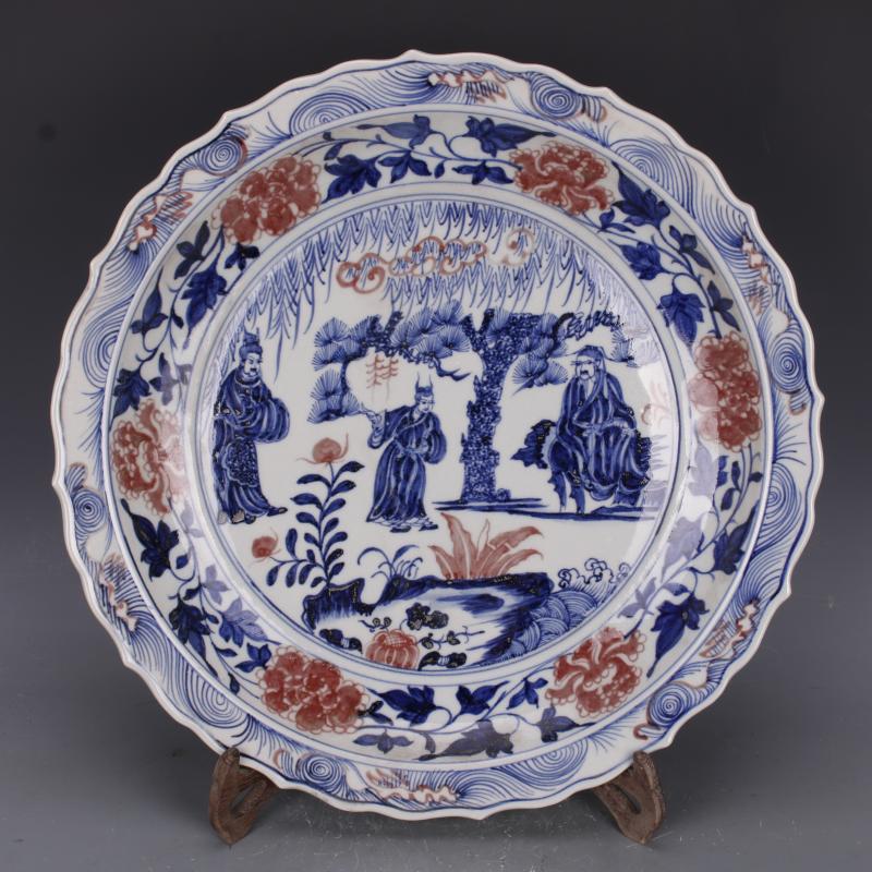 元青花釉里紅人物三顧茅廬葵口大盤手繪仿古老貨瓷器家居中式擺件1入
