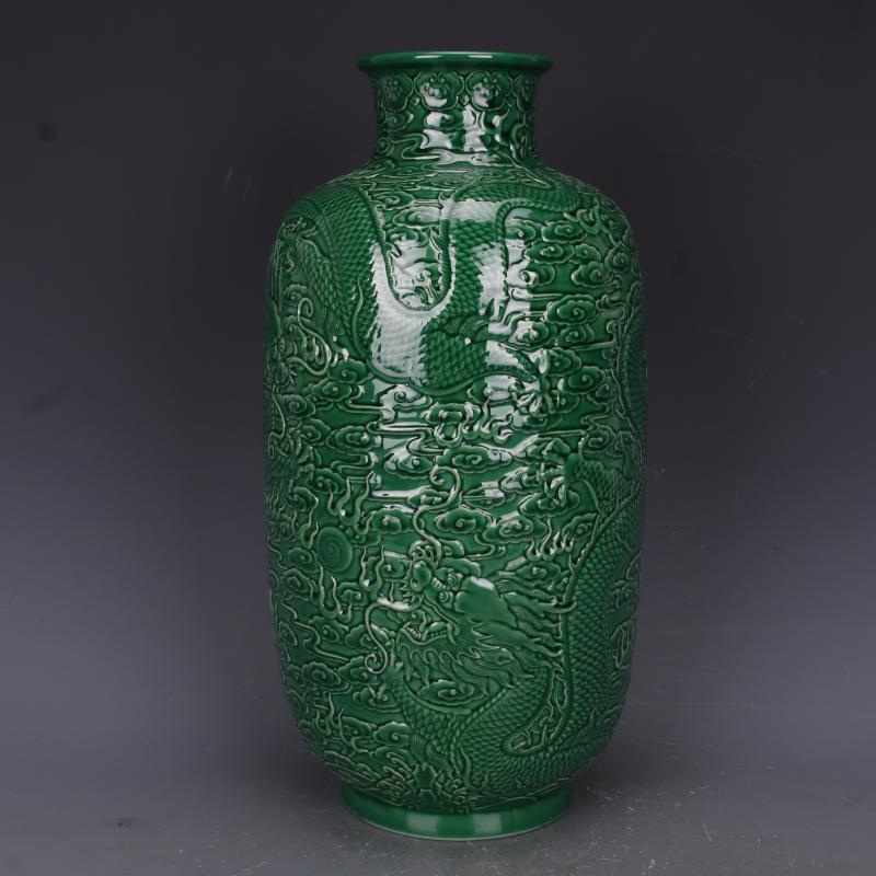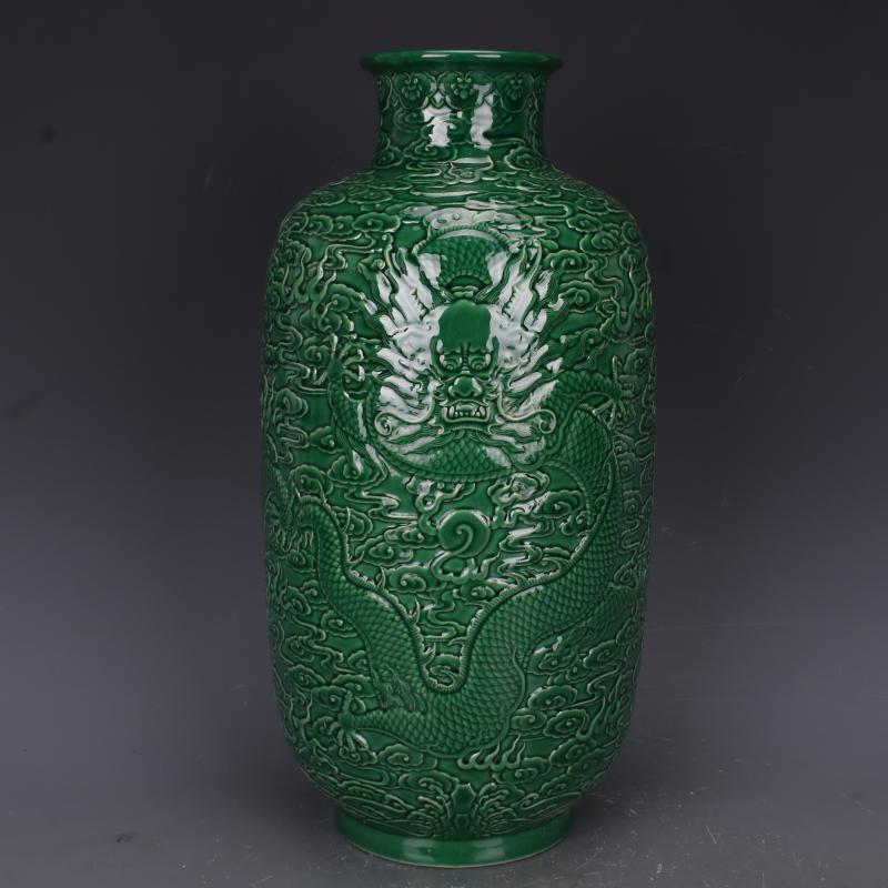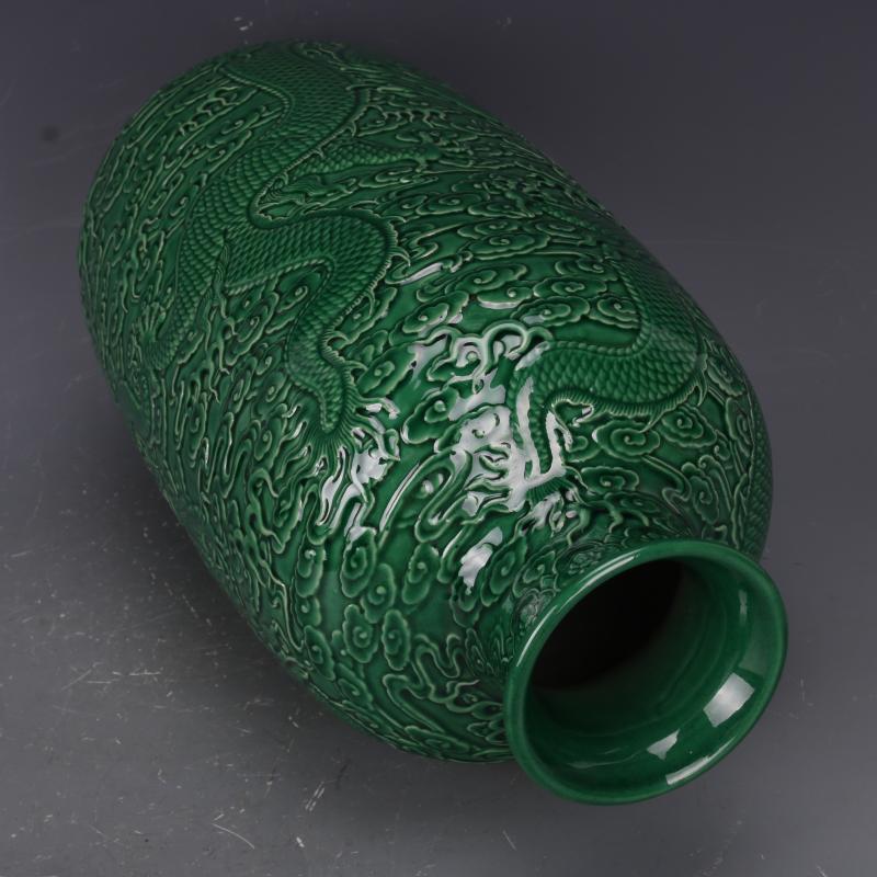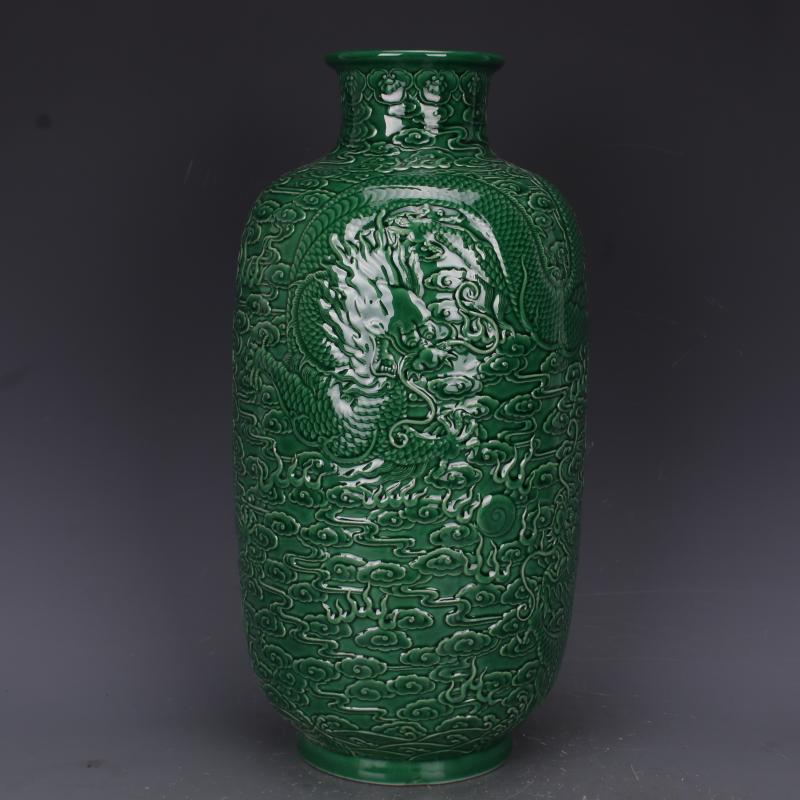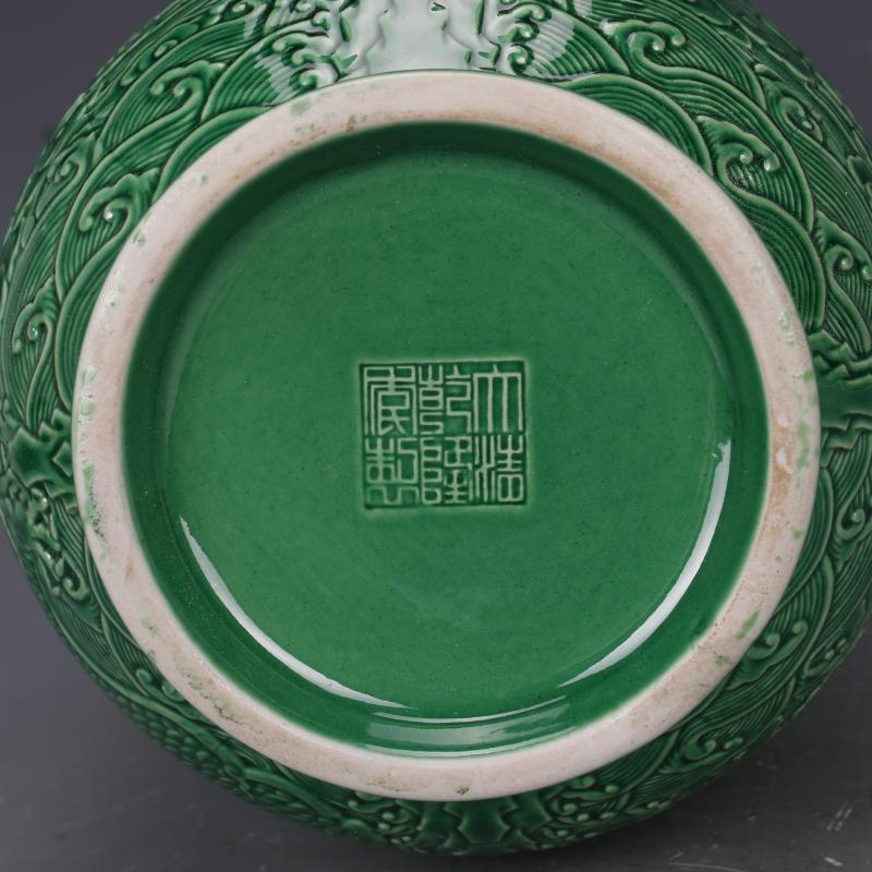 清乾隆綠釉浮雕刻龍紋冬瓜瓶仿古老貨瓷器家居中式擺件古董古玩1入