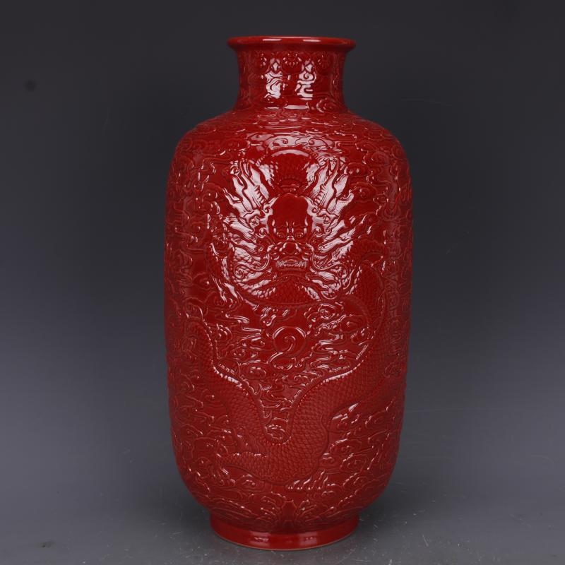 清乾隆紅釉浮雕刻龍紋冬瓜瓶仿古老貨瓷器家居中式擺件古董古玩1入