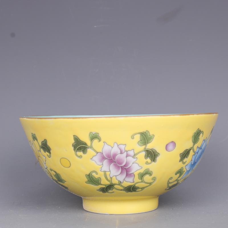 清雍正黃地粉彩花紋碗仿古老貨瓷器家居中式裝飾瓷器擺件古董古玩1入