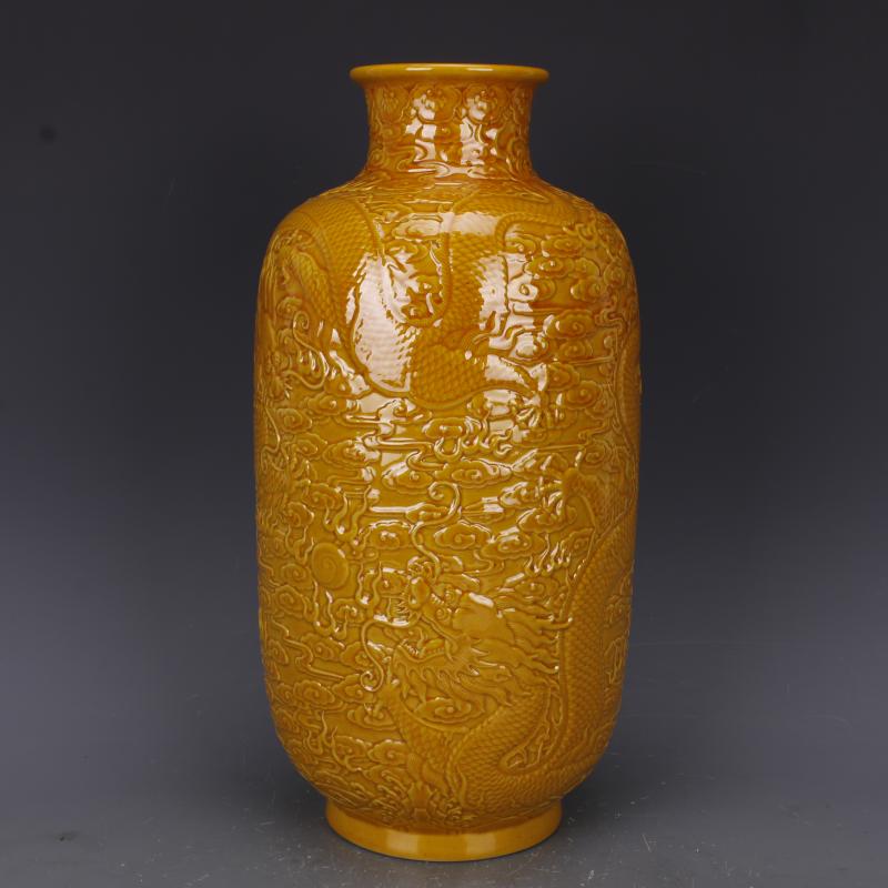 清乾隆黃釉浮雕刻龍紋冬瓜瓶仿古老貨瓷器家居中式擺件古董古玩1入