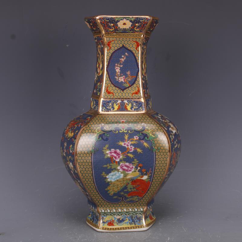 清乾隆描金琺瑯彩花鳥六方大肚瓶仿古工藝瓷器家居中式古玩擺件1入