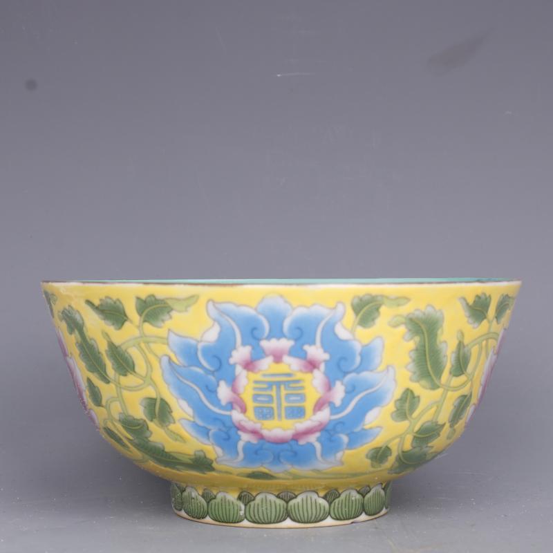清雍正黃地粉彩喜字花紋碗仿古老貨瓷器家居中式瓷器擺件古董古玩1入