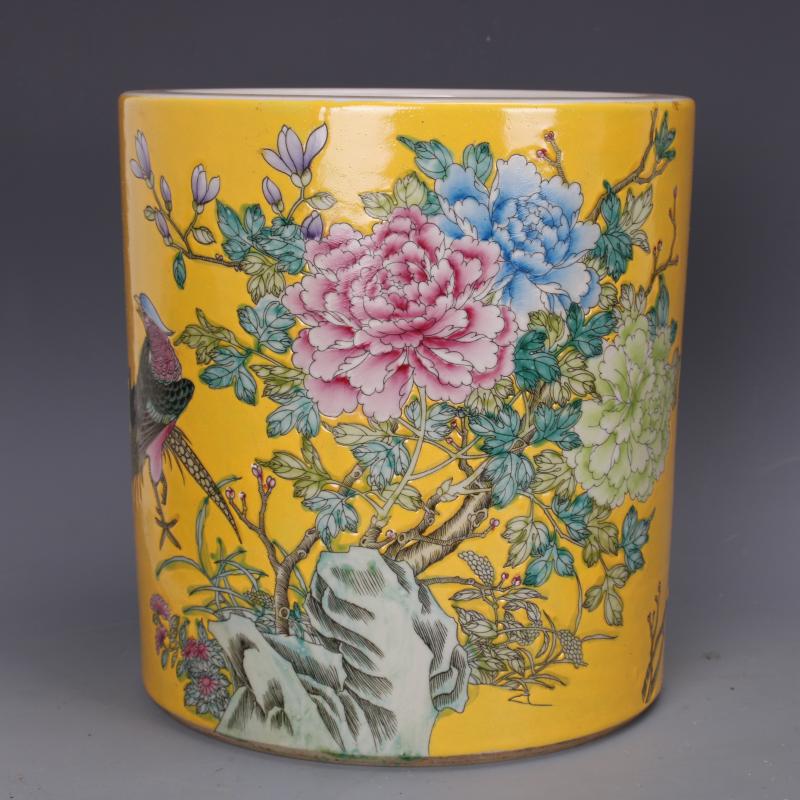清慈禧時期黃地粉彩花鳥紋筆海筆筒仿古老貨中式文房瓷器古玩擺件1入