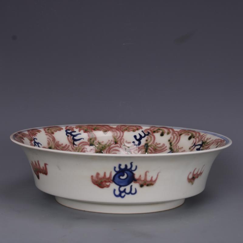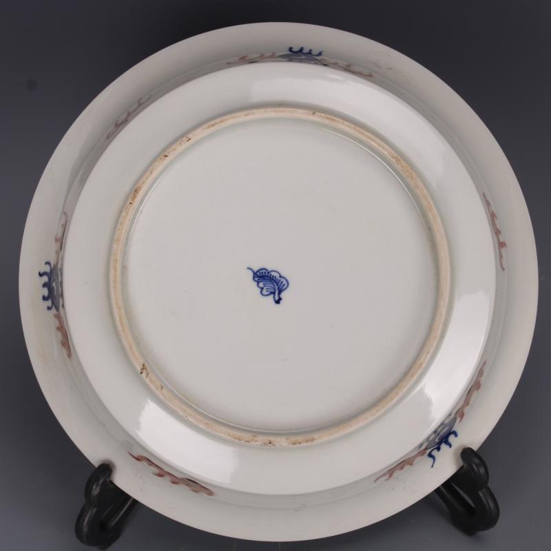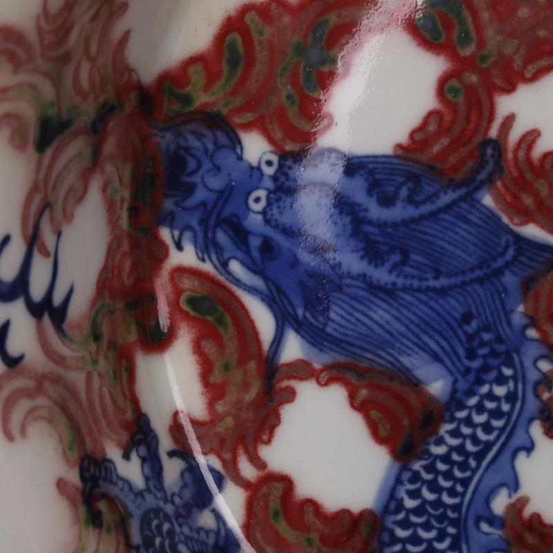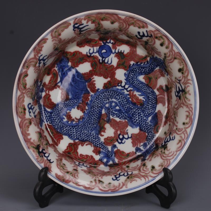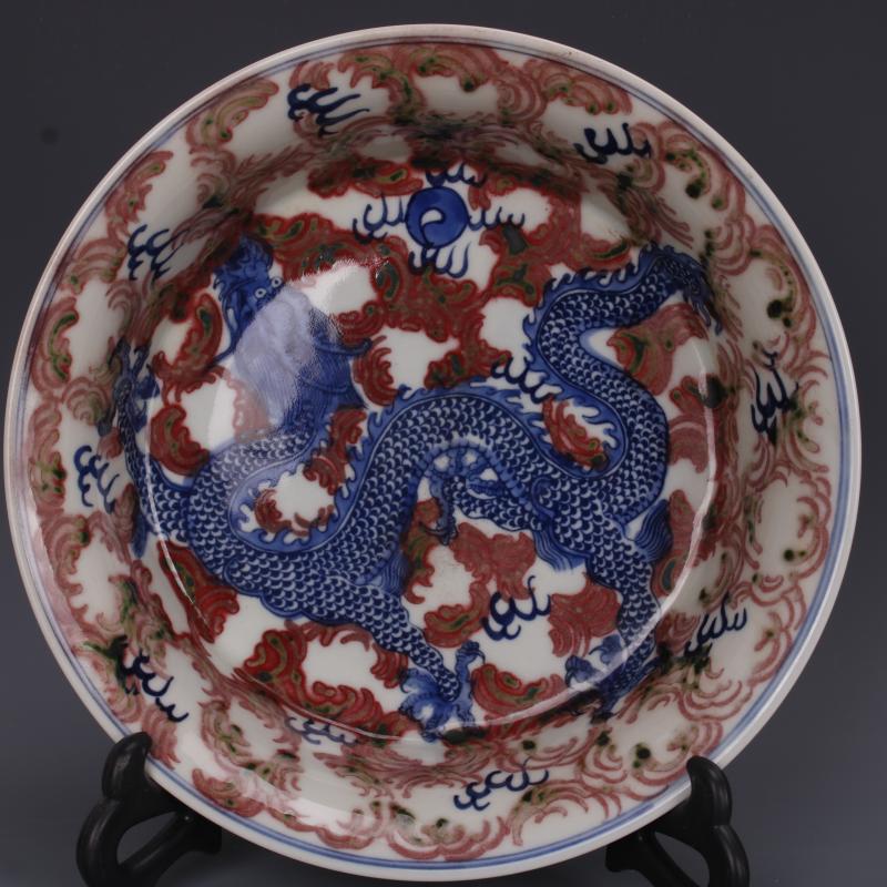 清康熙青花釉里紅云龍紋盤手繪仿古老貨瓷器家居中式擺件古董古玩1入