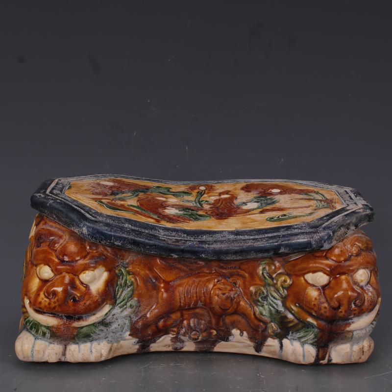 唐三彩浮雕刻荷花鴛鴦雙獅瓷枕仿古中式老貨家居瓷器擺件古董古玩1入