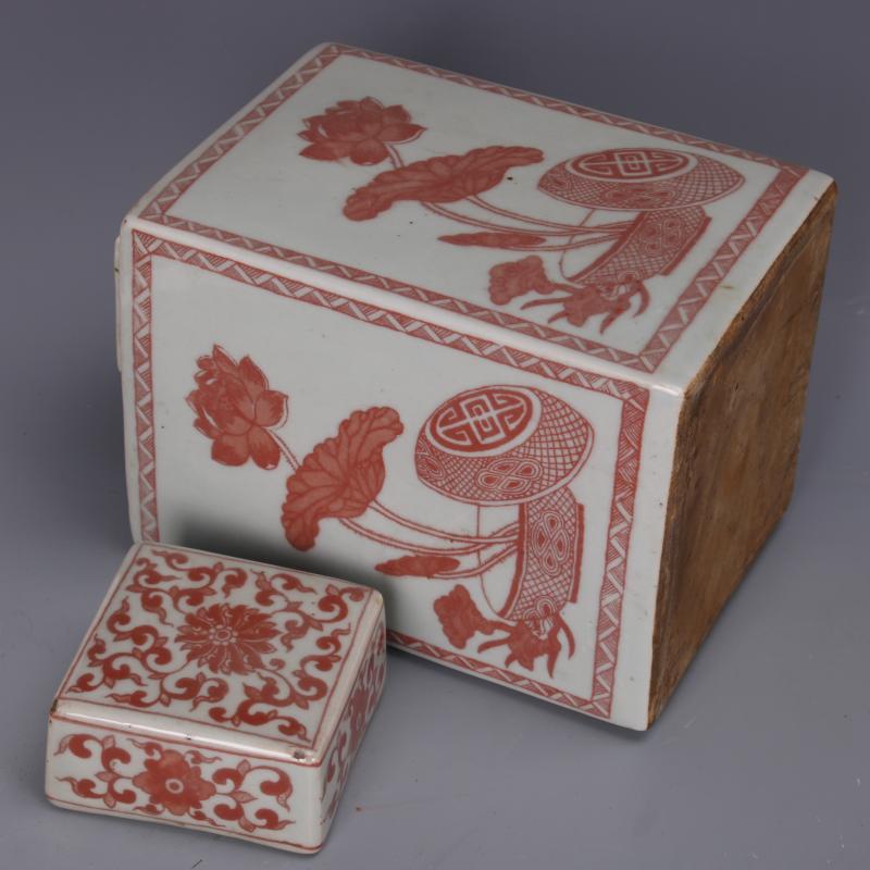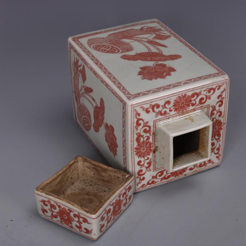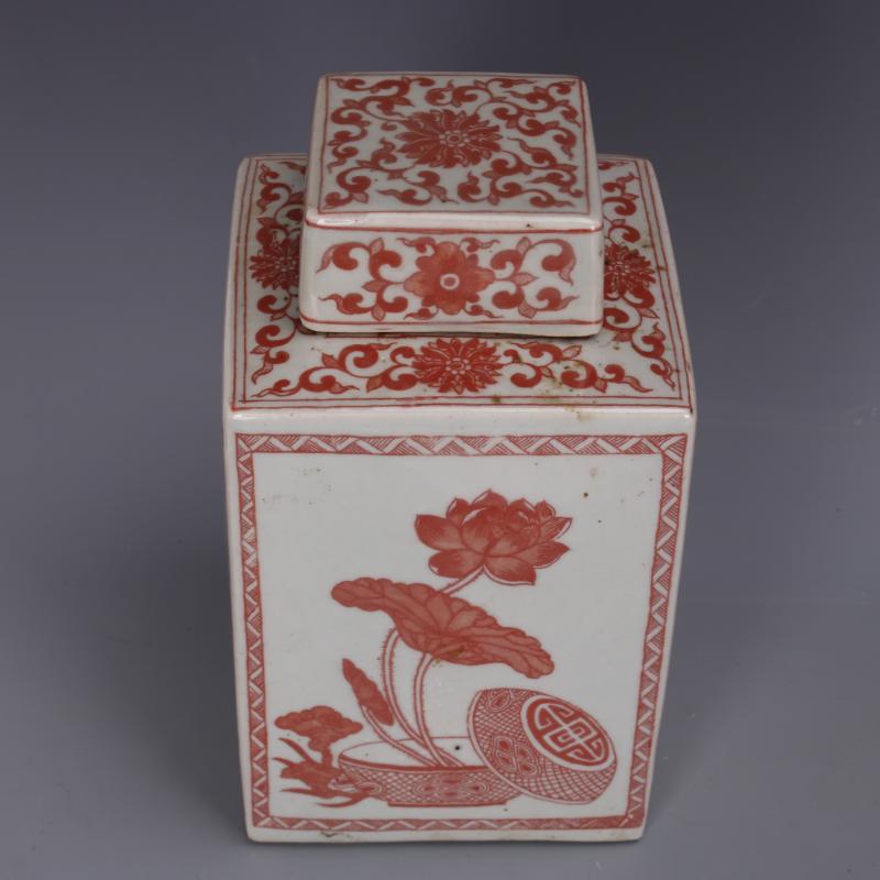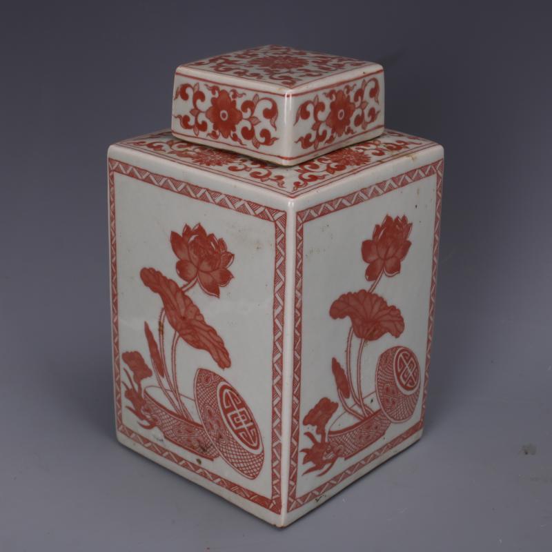 清康熙釉里紅荷花紋四方茶葉罐仿古老貨瓷器家居中式擺件古董古玩1入