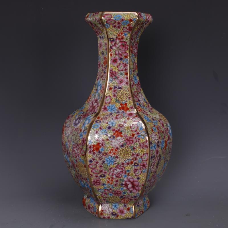 清乾隆描金粉彩萬花紋六方瓶仿古工藝瓷器家居擺件古董古玩收藏1入