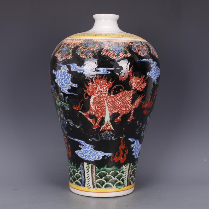 清康熙黑地粉彩麒麟紋梅瓶仿古老貨瓷器家居中式裝飾擺件古董古玩1入