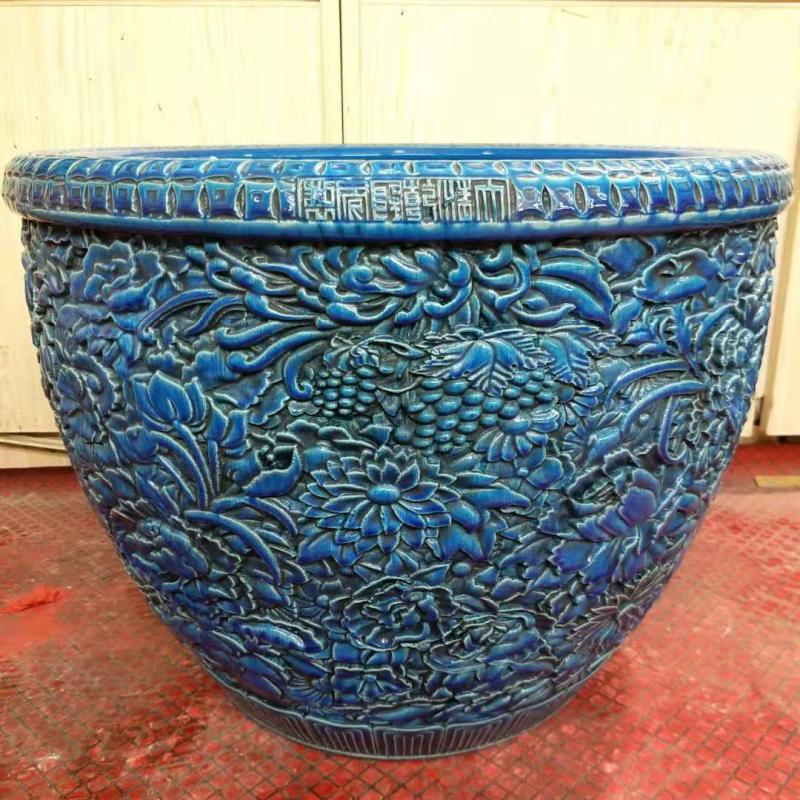 清乾隆雕刻萬花紋缸手工仿古景德鎮老貨瓷器中式擺件古董古玩收藏1入