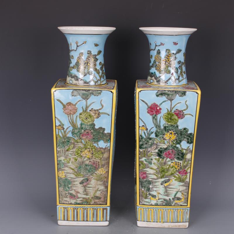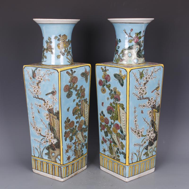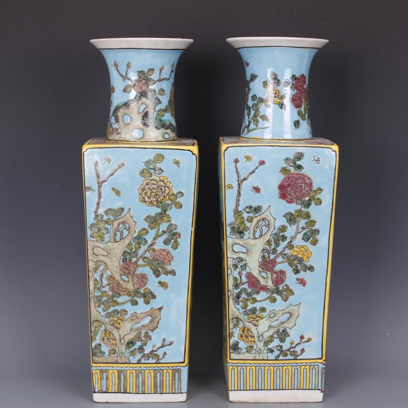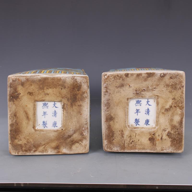 清康熙藍地粉彩四季花紋天圓地方瓶仿古中式家居擺件瓷器古董古玩1入