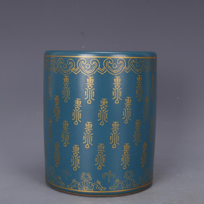 清雍正孔雀藍釉琺瑯彩壽紋筆筒仿古瓷器家居文房中式擺件古董古玩1入