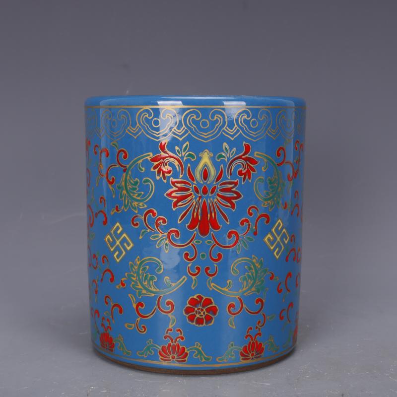 清乾隆豆青釉琺瑯彩花紋筆筒仿古瓷器家居文房中式擺件古董古玩1入