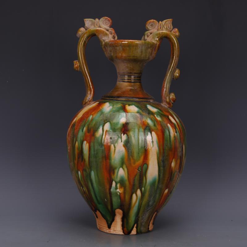 唐代三彩浮雕刻雙龍尊瓶仿古老貨家居復古中式裝飾古董古玩擺件1入