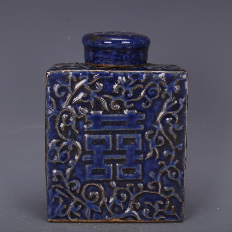 元祭藍釉雕刻纏枝喜字紋茶葉罐仿古老貨瓷器家居中式擺件古董古玩1入
