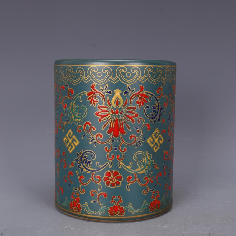 清雍正孔雀藍釉琺瑯彩花紋筆筒仿古瓷器家居文房中式擺件古董古玩1入