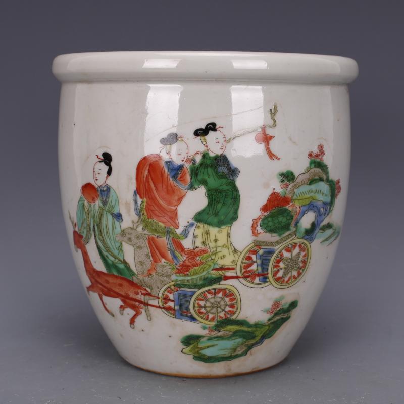清康熙古彩人物香爐缸仿古中式瓷器家居擺件古董古玩老貨古玩收藏1入