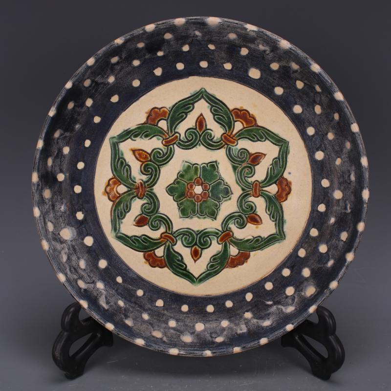 [4]唐三彩雕刻花紋盤民間老貨收藏精品家居中式擺件仿古瓷器古董古玩1入
