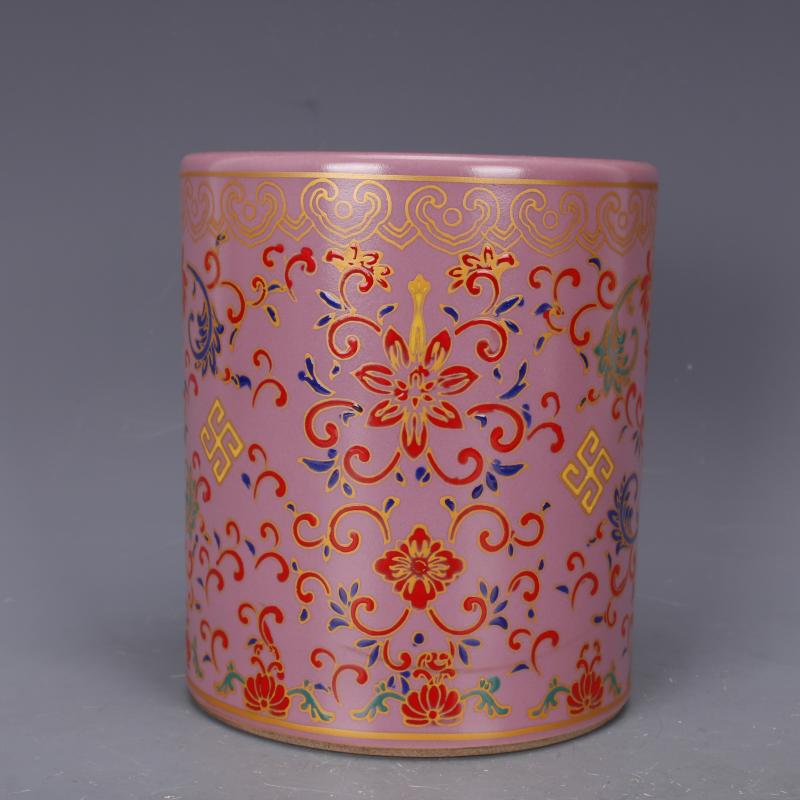 清雍正胭脂紅釉琺瑯彩花紋筆筒仿古瓷器家居文房中式擺件古董古玩1入