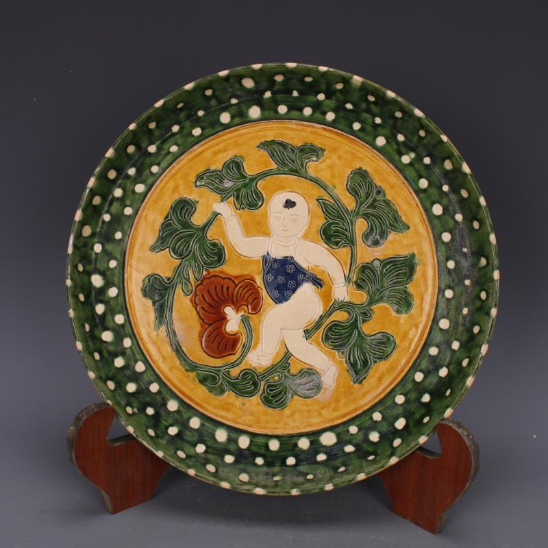 唐代三彩浮雕刻嬰戲紋平盤仿古出土瓷器家居中式擺件古董古玩收藏1入