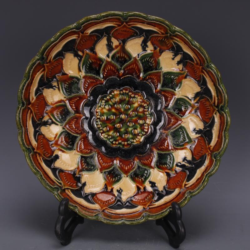 [2]唐三彩雕刻蓮花葵口盤民間老貨收藏家居中式擺件仿古瓷器古董古玩1入