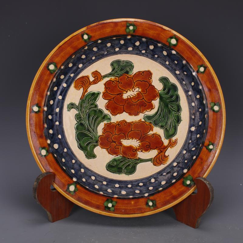 唐代三彩浮雕刻花紋平盤果盤仿古出土瓷器家居擺件古董古玩收藏1入