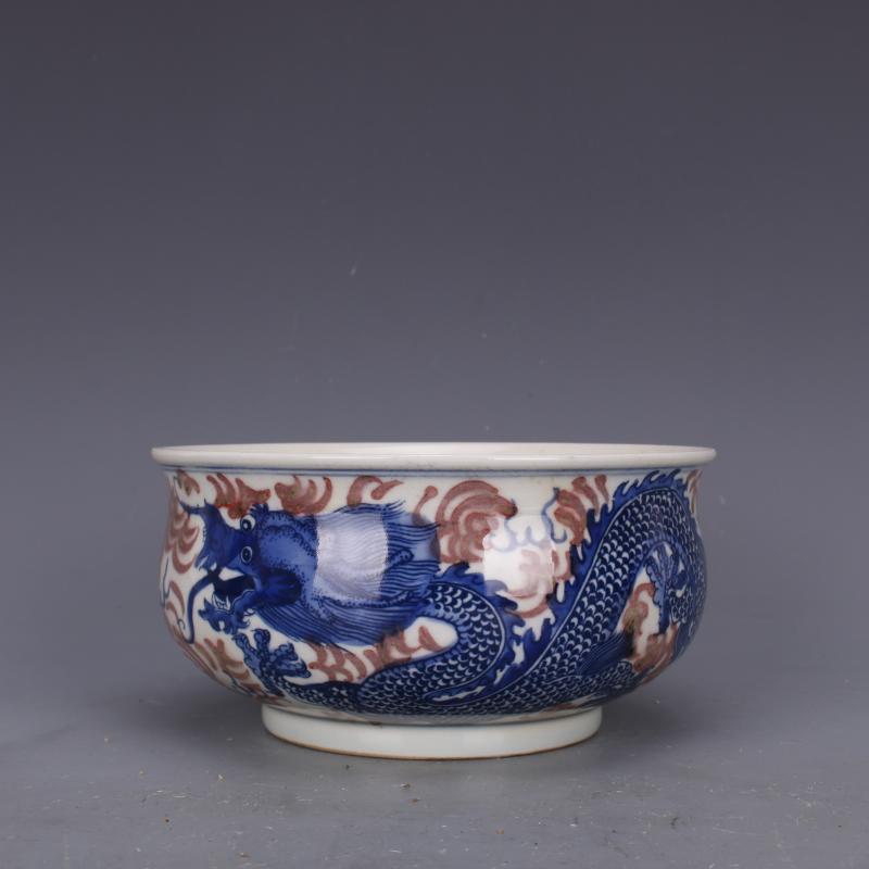 清康熙青花釉里紅云龍趕珠紋香爐缸手繪仿古中式家居擺件古玩收藏1入