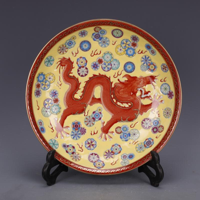 清雍正黃地粉彩穿花云龍紋盤仿古瓷器家居博古中式家居擺件古董古1入