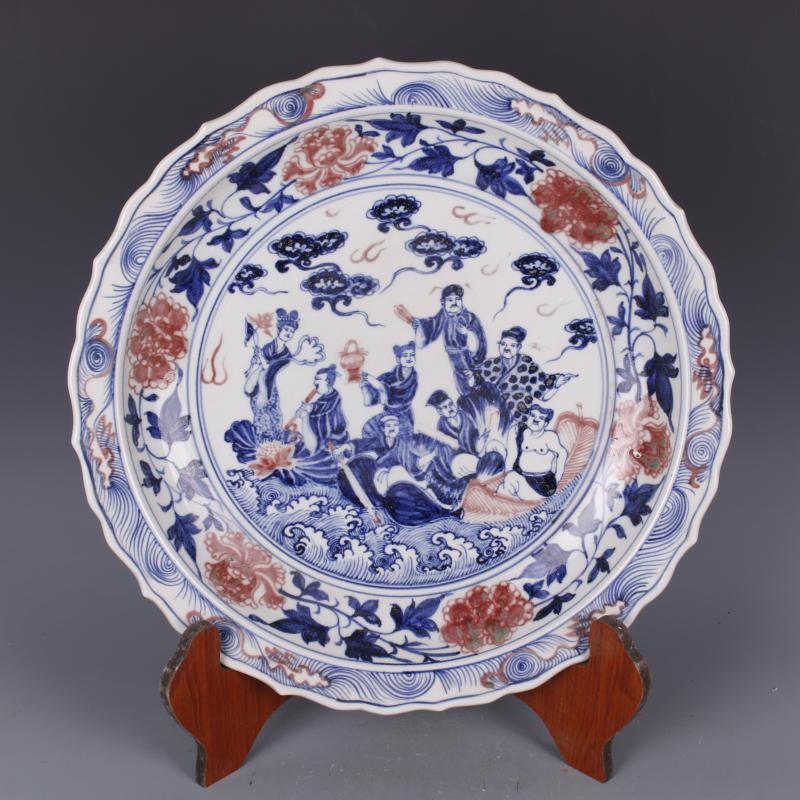 元青花釉里紅八仙人物葵口大盤仿古老貨瓷器家居擺件古董古玩收藏1入