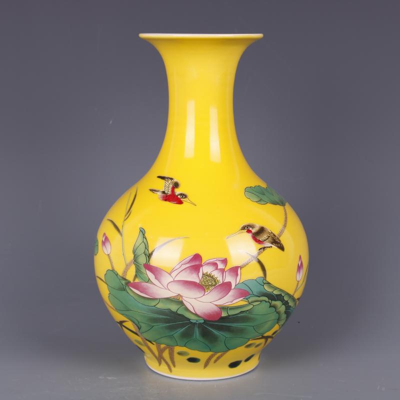 清乾隆黃地粉彩荷花花鳥玉壺春瓶仿古中式家居瓷器擺件古董古玩1入