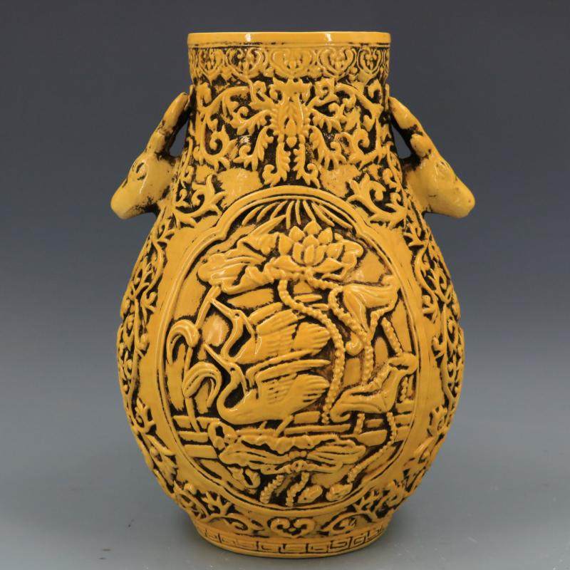 民國黃釉浮雕刻荷花花鳥鹿頭尊福筒仿古老貨工藝品瓷器家居擺件1入
