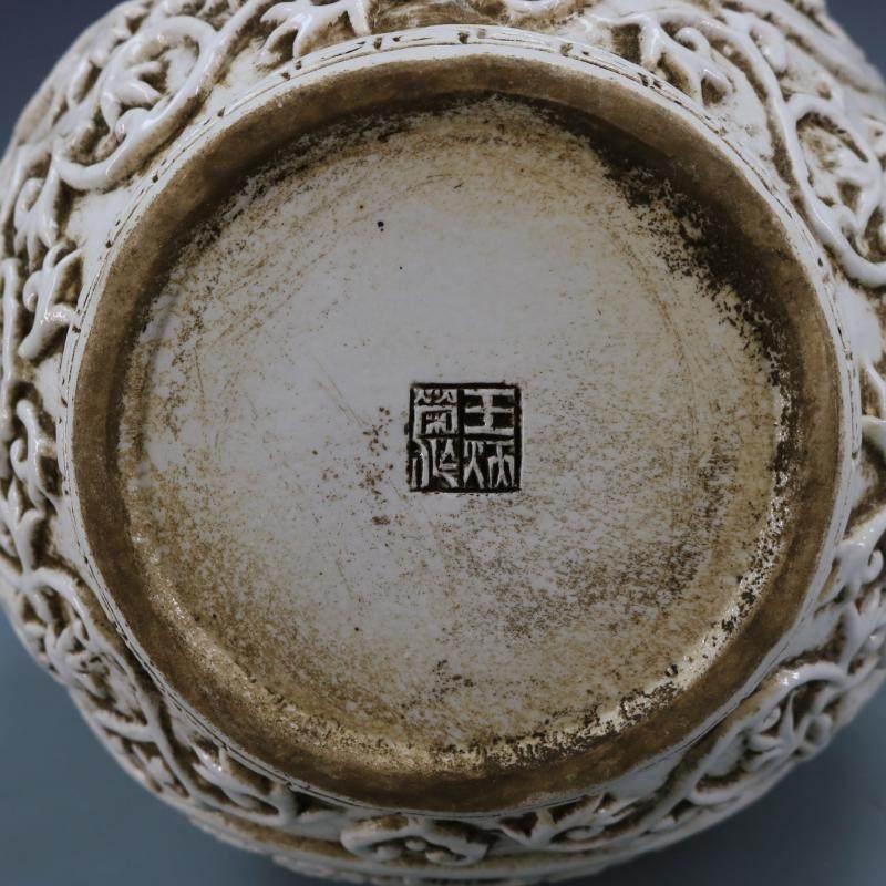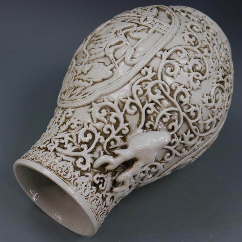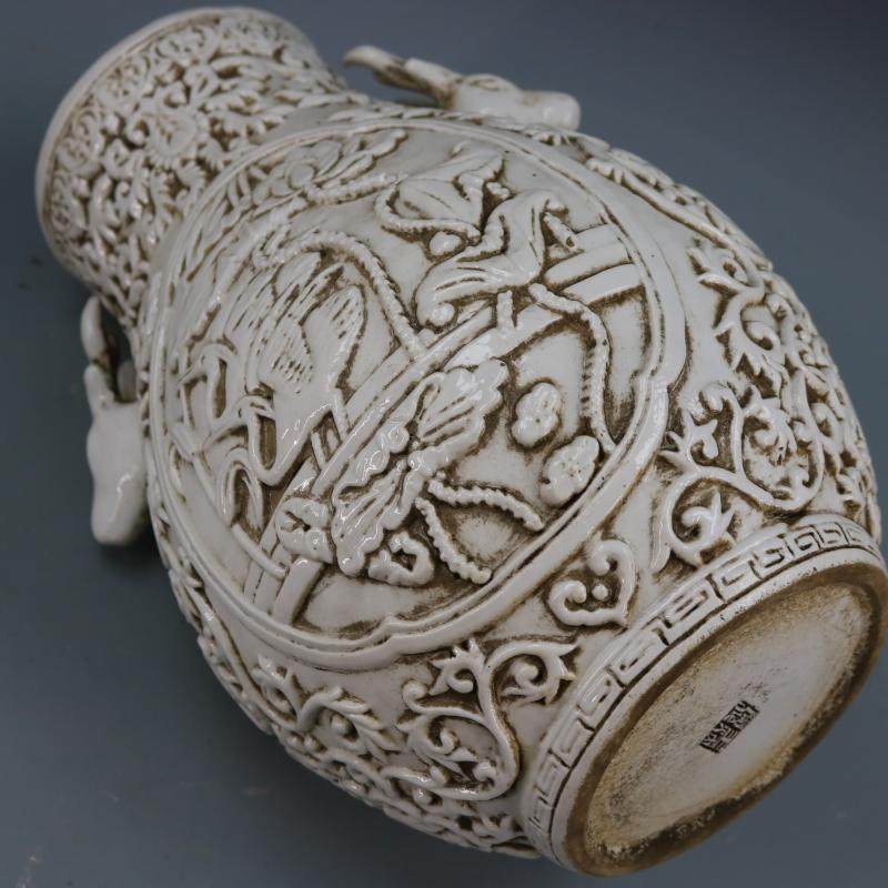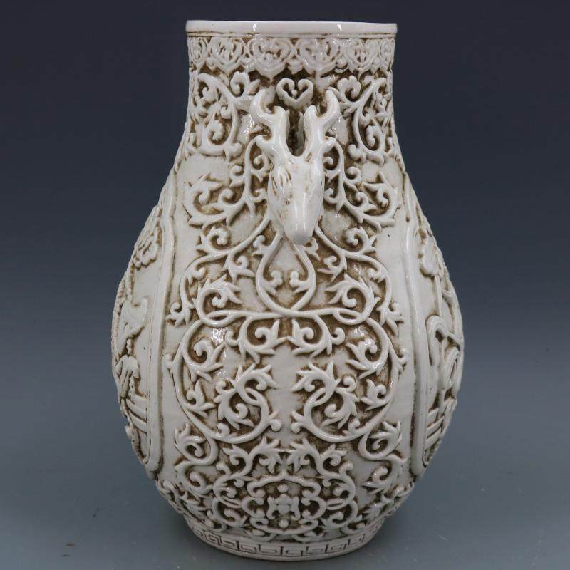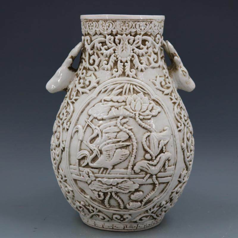 民國甜白釉浮雕刻荷花花鳥鹿頭尊福筒仿古老貨工藝品瓷器家居擺件1入