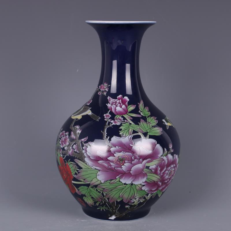 清乾隆藍地粉彩牡丹花鳥玉壺春瓶仿古中式家居瓷器擺件古董古玩1入